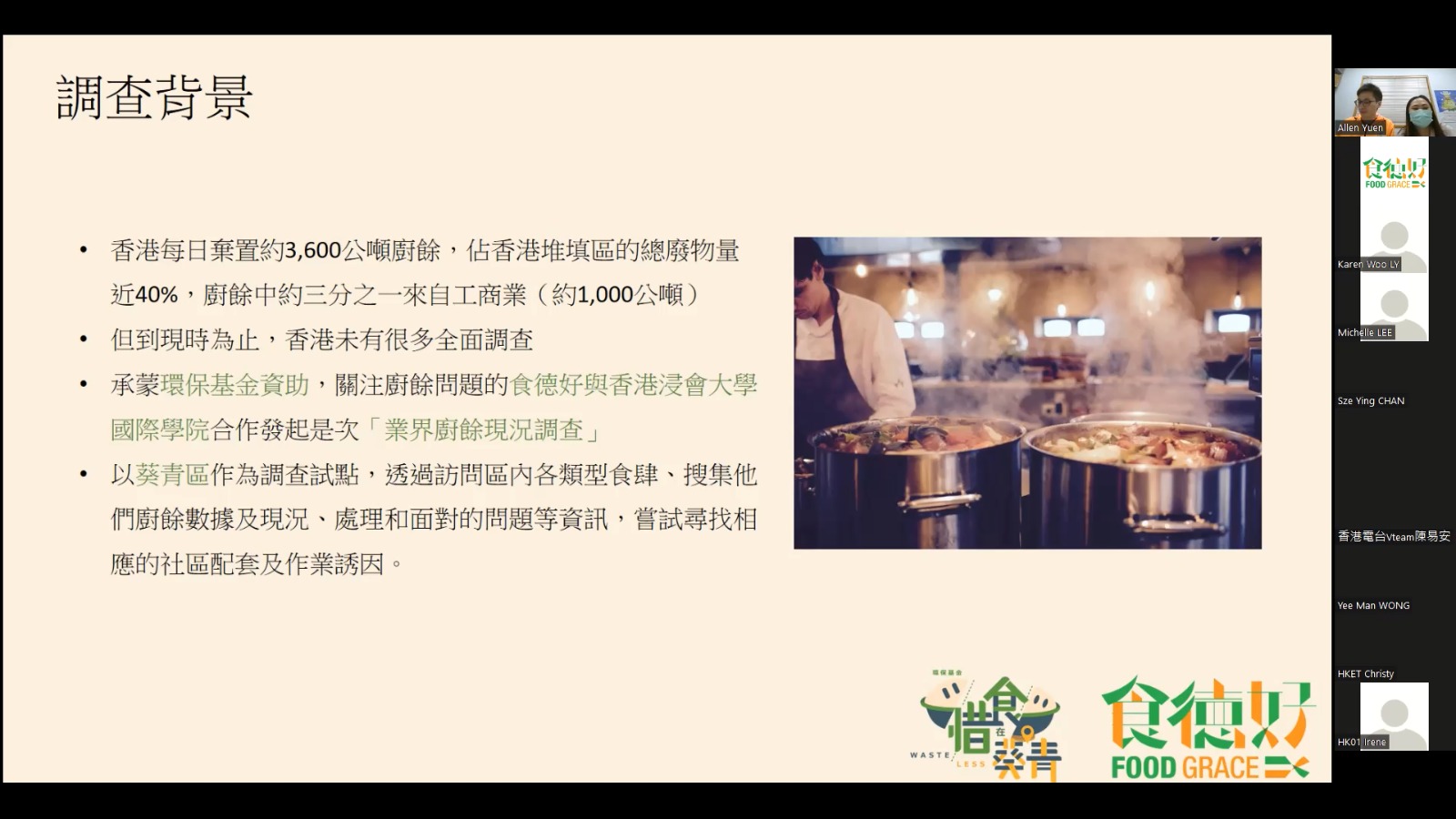 現時香港每日棄置約 3,600 公噸廚餘,佔香港堆填區的總廢物量近 40%,廚餘中約三分之一來自工商業(約 1,000 公噸)。餐飲廚餘為工商業廚餘種類之一,作業浪費程度及其處理廚餘的方法也為大眾關注。但到現時為止,香港尚未有很多全面調查,以搜集各類食肆(特別是中小型食肆)處理廚餘的現況、減廢意識及處理廚餘的困難等資料,整全並有系統地分析到當前業界面對的廚餘處理問題。承蒙環保基金資助,關注廚餘問題的食德好發起是次「業界廚餘現況調查」,並與香港浸會大學國際學院合作,以葵青區作為調查試點,透過訪問區內各類型食肆、搜集他們廚餘數據及現況、處理和面對的問題等資訊,嘗試尋找相應的社區配套及作業誘因,最終動員到區區減少廚餘,並於今日舉辦調查發佈會。